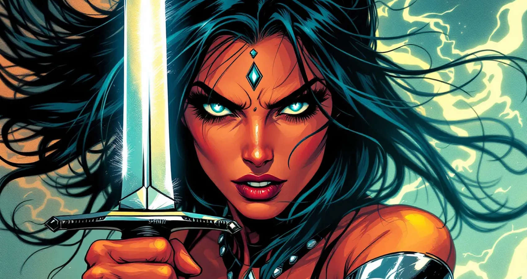 The woman on this cover looked more self-reliant. She was holding a sword, battling against a green-skinned, multi-limbed creature that was dripping venom from its huge fangs. Two suns blazed in a purple sky. The woman was more slender than the bosomy females the artists loved to depict, but she was, predictably, semi-naked, in a kind of metallic brassiere, a swordbelt, and a short skirt made from strips of metal-studded leather. With her coppery-red skin and waist-length black hair, she might have passed for a native American, except for the diamond-shaped, brilliant turquoise eyes, and her ears, which were of the long pointed kind so favoured by fantasy artists. She was clearly as extra-terrestrial as her adversary.