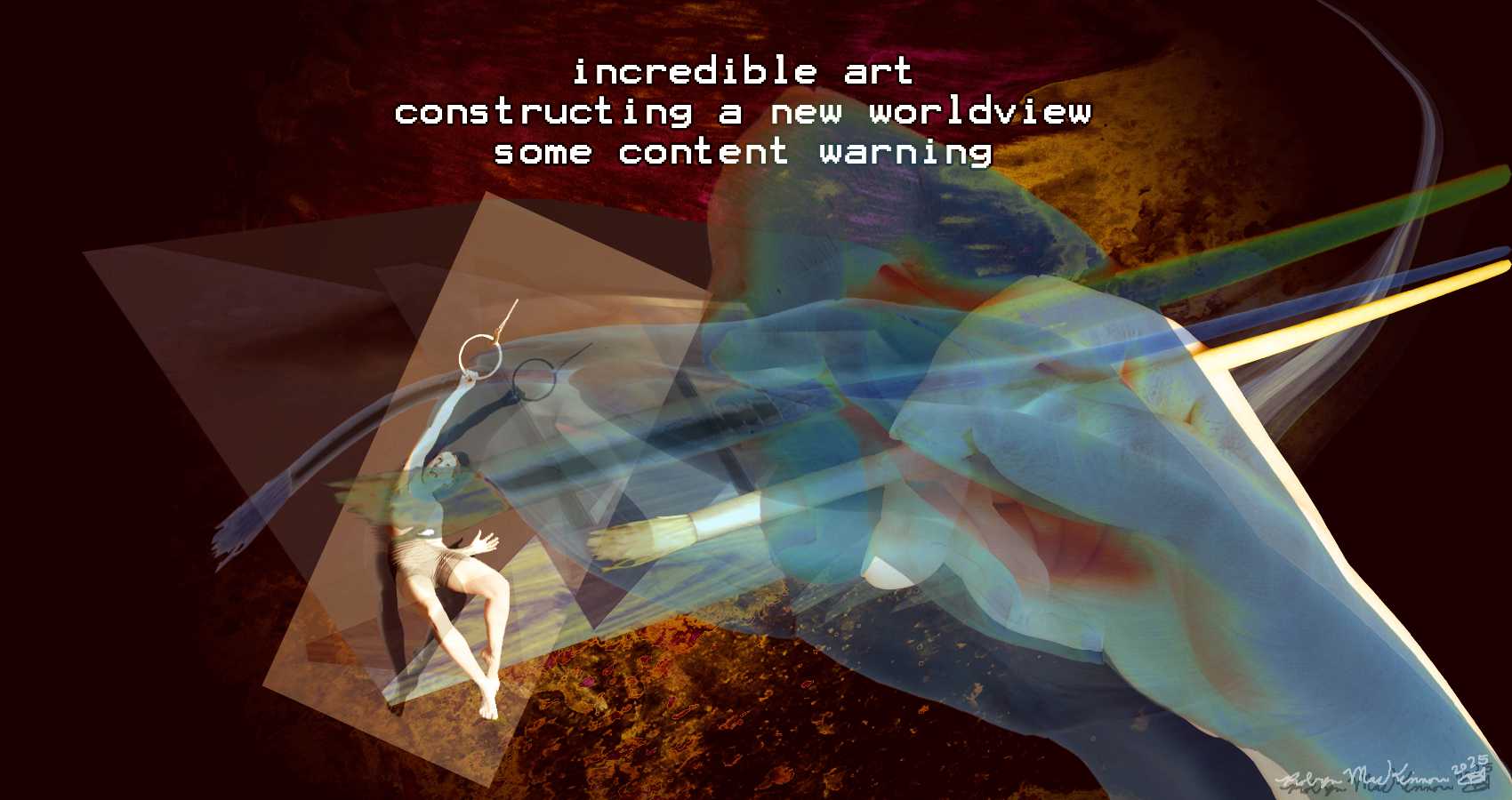 Illustration description: A dark, chaotic background with a glow like soldering coals. The haiku sits top and center in white “Terminal Regular” font thinly outlined in black. In the foreground, a hand wields a paintbrush at a figure swinging from a ring attached to the inside of a floating hallway. The hallway is distorted and echoes itself into the distance of the space, much like the paintbrush-wielding hand seems to echo and distort in the foreground. The figure appears feminine, wearing shorts, a short tank top, hair pulled back, and a terrified expression.