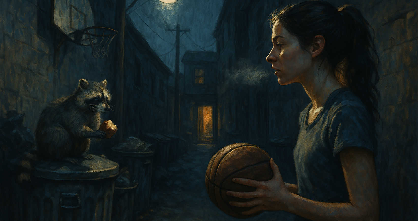 For weeks, months even, we’d see each other in the alley almost every night. I’d noted he was a male, obvious reasons, and he was always alone, which I knew wasn’t unusual for male raccoons. He would eat; I would play ball. I’d made up my mind to call him Charlie after my favorite childhood book, Charlie and the Chocolate Factory, and I’d narrate my games for him, telling him how many points I had, how many fouls, and if the refs were being unfair. He’d listen as he chewed, looking for all the world like he cared.