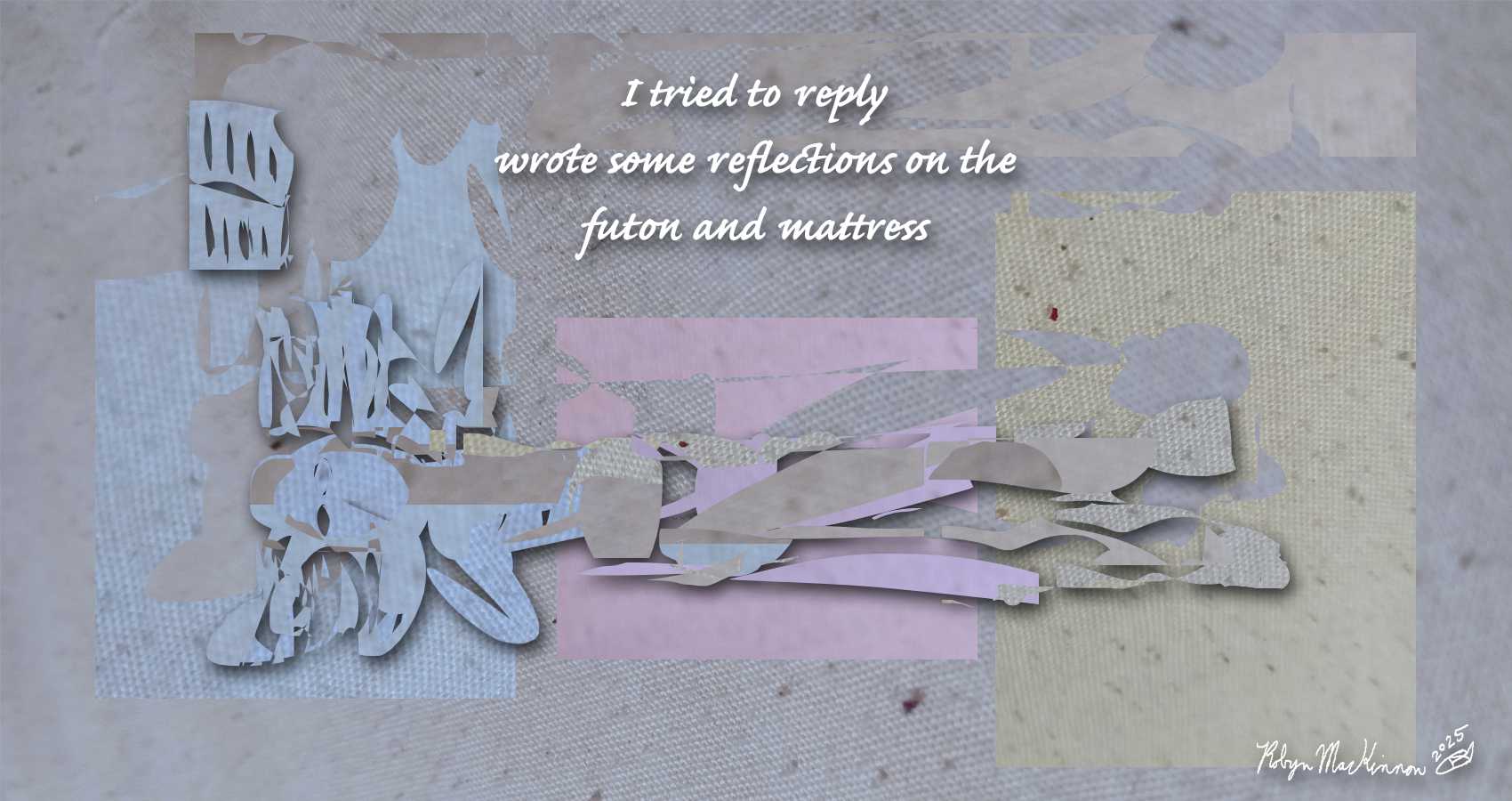 Illustration description: The textures in this piece are derived from a snapshot of an old, pilly pillowcase. Using colour alteration tools in Adobe Photoshop Elements, I created a patchwork background in muted, pastel colours, from which I then cut the shape of a figure lying horizontally across the image on their back, hair spread out to either side of their head. I took a few more fragments to create the shape of the book in the upper left. The words of the haiku seemed well placed top and centre in white Caflisch Script Pro Bold font. Adding drop shadows to the text, the book, and the figure added the definition I was looking for.