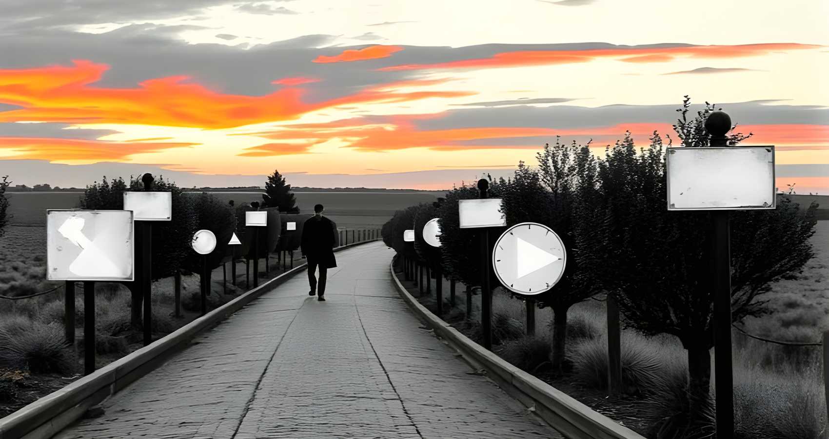 In a space with black walls and dilapidated clocks…