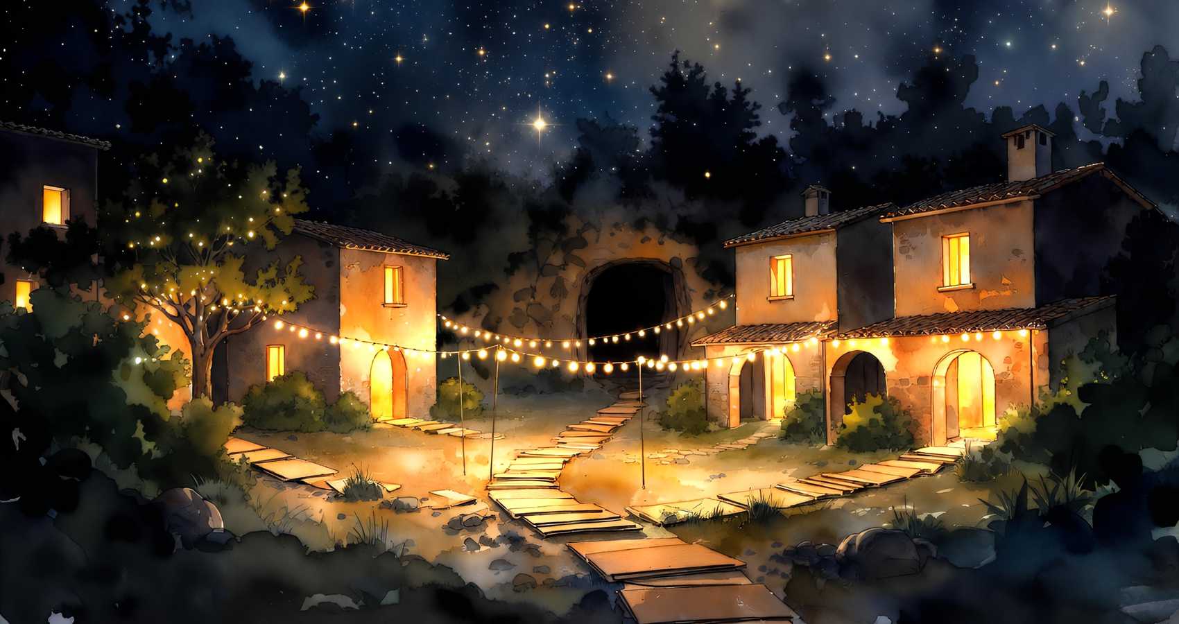 While the Christmas lights furtively stretch toward a cobalt sky and the cardboard paths lead to the cave