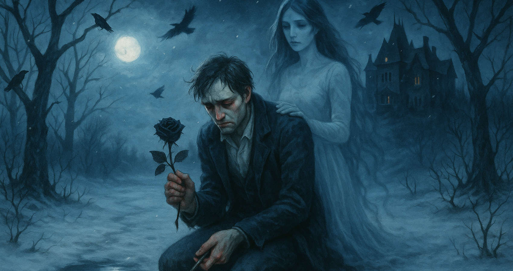 On an oppressively cold winter’s night, the wind gnawed at my face and howled like a dread wolf as I knelt in the courtyard; I was in solitude, save for crows overhead, as I held a single black, undying rose. The thorns pierced my hand, but I could not bring myself to relinquish the flower. Looking upon the melancholy scene before me, I saw the black manor overlooking the bleak horizon in the distance atop the snow-covered hill.